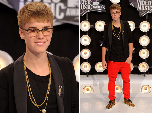 Justin inovou no estilo para ir à premiação! Com calça vermelha, uma cobra na mão (!) e tênis com estampa de oncinha, o gato chamou a atenção por onde passou. E reparem no óculos: uma mistura de intelectual com moderno… Nós amamos! E é claro que nao é só na moda que Justin arrasa: ele levou o prêmio de “Melhor Clipe Masculino”, entrege pela recém casada Kim Kardashian.