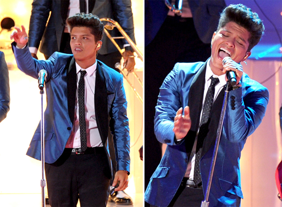 Com seu habitual topete e com um blazer azul, Bruno Mars arrancou suspiros da plateia feminina no VMA. E lindo desse jeito, quando ele começou a cantar o tributo a Amy Winehouse com a música “Valerie”, tudo o que conseguíamos pensar era: canta pra gente Bruno!