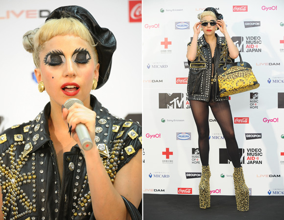 A gente nem sabe se pode chamar isso de plataforma, né!? Essa meia pata que Lady Gaga adora usar vai muito além de qualquer sapato suuuper alto que a gente já viu por aí! Para deixar o visual ainda mais ousado, a cantora combinou as tachas do sapato com as do colete, e com o amarelo da bolsa, para ir ao MTV Video Music Aid Japan. Isso sem contar com o make imitando um olho enorme!