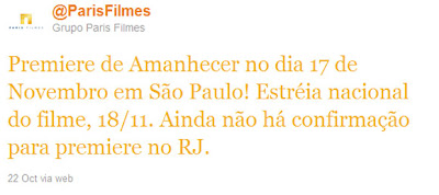 Faltando menos de um mês para a estreia do filme, produtora garante première na cidade. Quem do elenco deve vir ao país?Preparem os gritos, os cartazes e as camisetas da "Crepúsculo"! É que a Paris Filmes, distribuidora da saga aqui no Brasil, confirmou na manhã deste sábado (22/10), através do Twitter, a première de"Amanhecer - Parte 1" em São Paulo.