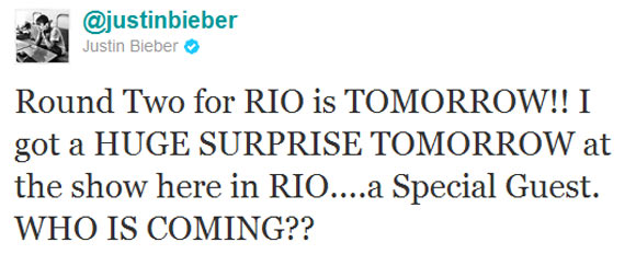 Atenção, fãs que vão ao show do Justin Bieber nesta quinta (06/10)! O cantor, que fez seu primeiro show da turnê “My World” no Rio nesta quarta (05/10), prometeu, através de seu Twitter, que trará mais surpresas ao palco do 2º show no Rio.